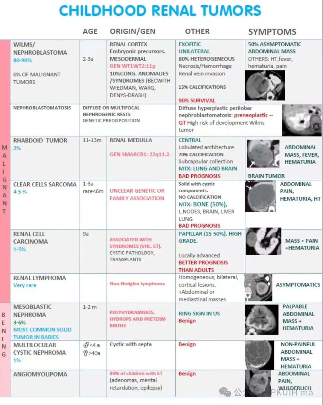 发生于婴幼儿肾肿瘤有:CMN、肾母细胞瘤、透明细胞肉瘤(CCSK)、横纹肌样瘤(MRT)、囊性肾瘤和囊性部分分化性肾母细胞瘤(CPDN)和婴儿骨化性肾肿瘤(ORTI)。下图为儿童肾肿瘤的常见病理类型及特征