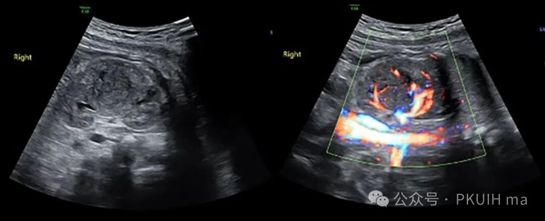 中胚层肾瘤(CMN)是一种儿童少见的良性肿瘤,约占儿童肾脏肿瘤的3.4%,发生率为1:125000。发生于新生儿及婴儿早期,高峰年龄1-3月,是3个月以下婴儿最常见的肾脏肿瘤,90%小于1岁、部分可于产前超声发现,80%在新生儿期发现,多发生于男性,男女比2:1,好发于右侧肾。对于婴儿发现的肾肿瘤首先考虑中胚层肾瘤,其次考虑肾母。无特征表现,多表现为腹部包括或肾脏占位,70%有难治性高血压、10%有血尿、1.2%-12%高血钙。产前发生时多合并羊水过多。CMN可分为经典型、细胞型和混合型,组织学均表现成纤维细胞排列成束,细胞型与婴儿纤维肉瘤具有相同的染色体异位t,目前被认为是起源于肾脏的婴儿纤维肉瘤。超声表现为实性肿物周围伴有低回声晕环。增强扫描呈轻中度强化,可见瘤内局灶性明显强化区,文献报道增强扫描病灶内环形强化可能有提示诊断的意义。CMN主要采用手术治疗,预后良好。