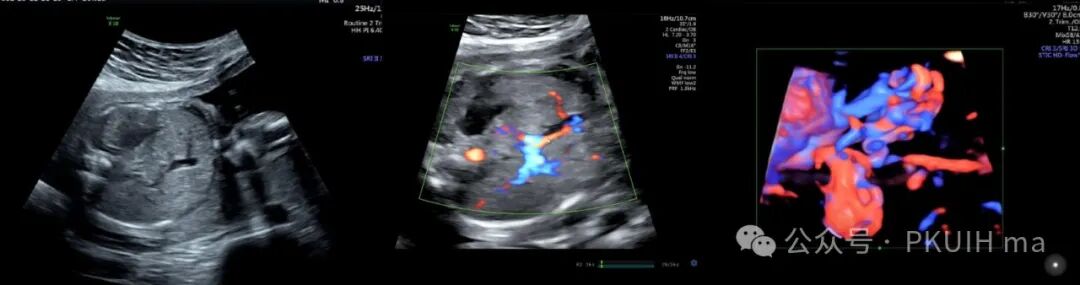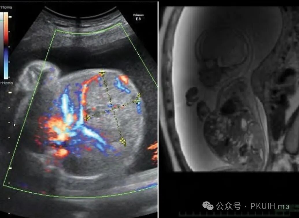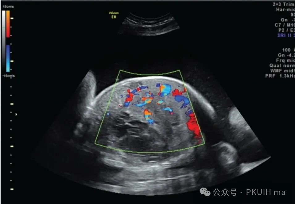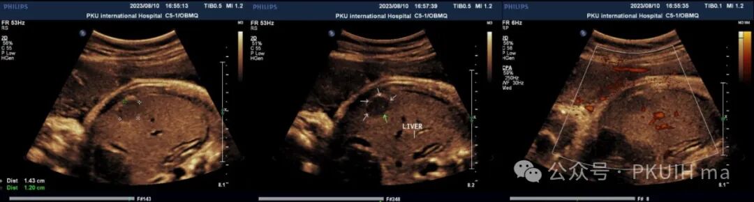 上图是一例孕晚期发现肝内实性占位,在出生后的随访中一直无明显变化,初步考虑是肝血管瘤。