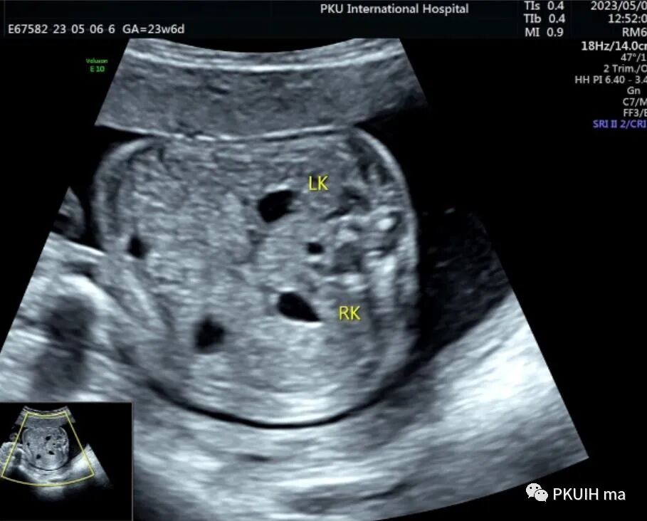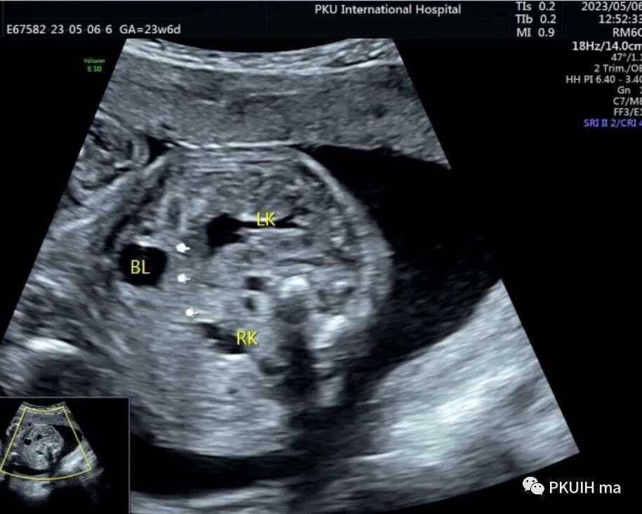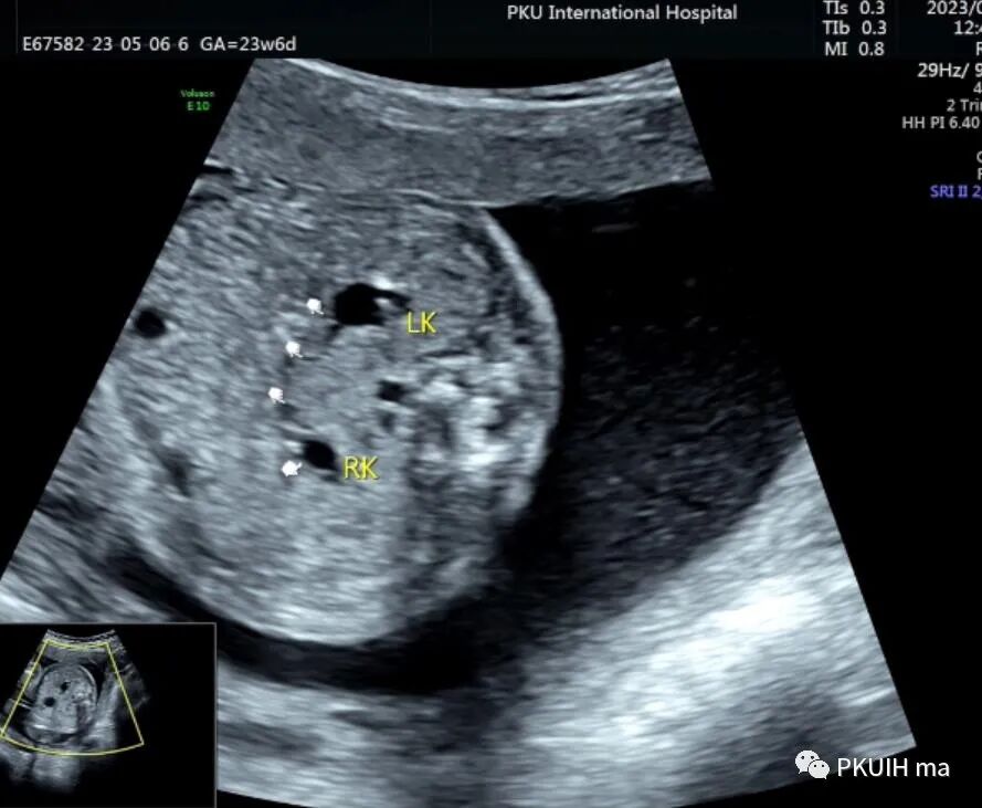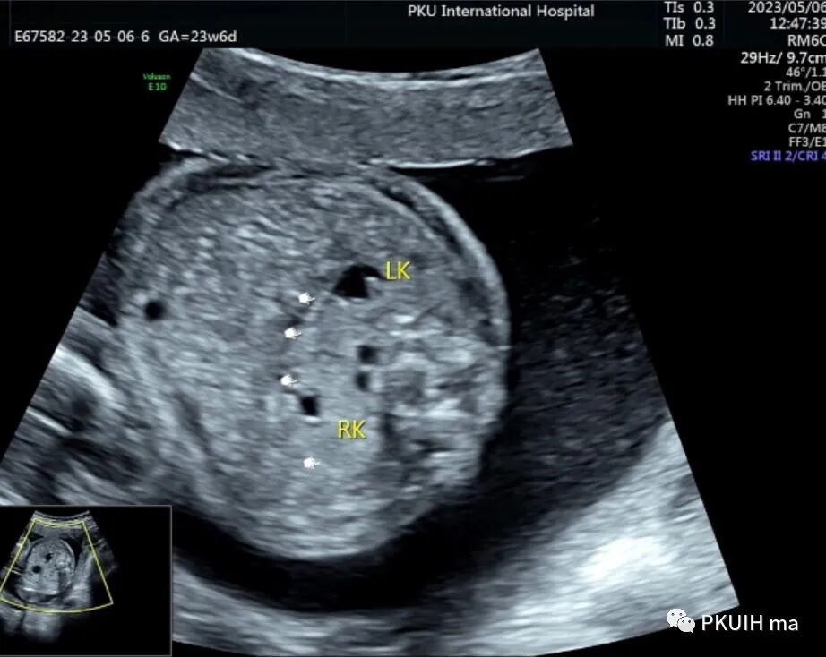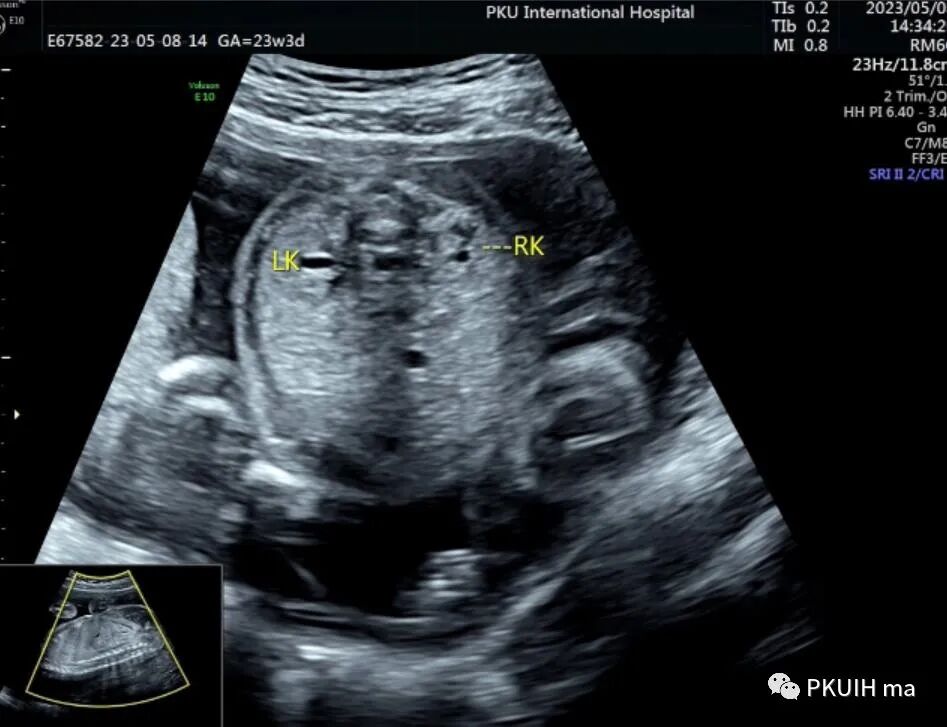 今天跟大家分享一个马蹄肾胎儿,23周常规系统排畸,矢状切发现胎儿肾脏偏长,下极边界相对不清晰,横断面发现肾盂有点轻度分离,但肾盂分离的方向有点不对劲,随仔细观察胎儿双肾。