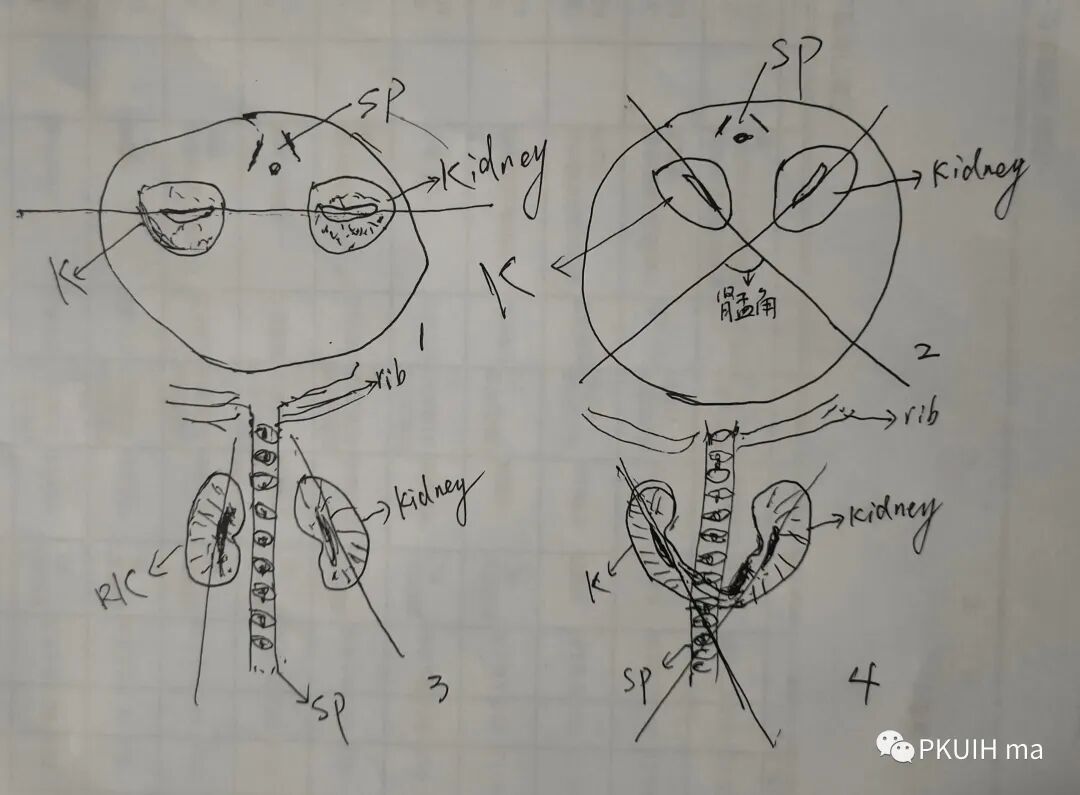 图1、3是正常肾示意图,2、4是马蹄肾示意图(SP:脊柱,K:肾脏,rib:肋骨),有文献报道说采用肾盂角来预测马蹄肾,一般肾盂角<140°可疑马蹄肾。