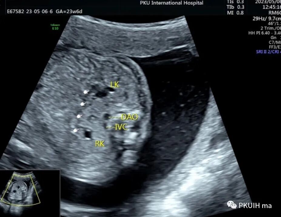 仔细观察双肾下极越过腹主动脉于腹主动脉和下腔静脉的前方相融合,同时肾的位置相对低,下极接近胎儿膀胱。(DAO:降主动脉,IVC:下腔静脉,BL:膀胱)