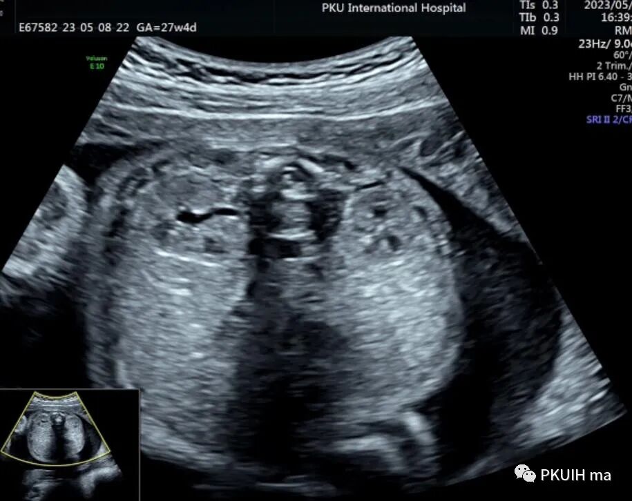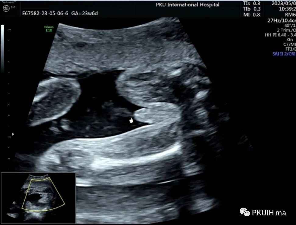 马蹄肾在日常成人超声中并非罕见,发病率约2.5‰,是一种先天肾融合畸形。一般男性多见,男女比例约2:1。通常多是肾下极融合,上极很少见,由于形似马蹄,故名“马蹄肾”。本例马蹄肾胎儿就是一个Boy宝宝,可以观察到胎儿外生殖器呈XY特征,检查中并可见小宝宝正在排尿(见下图)。