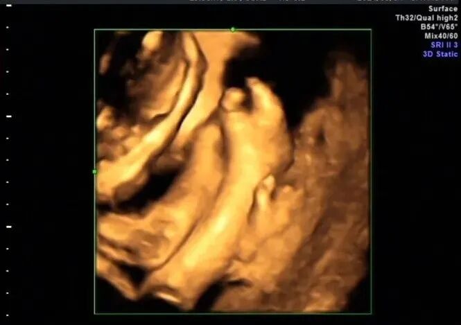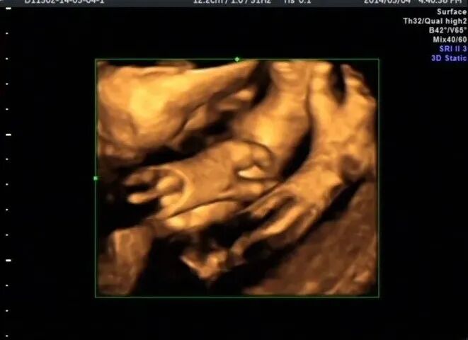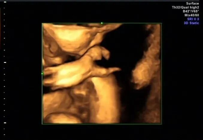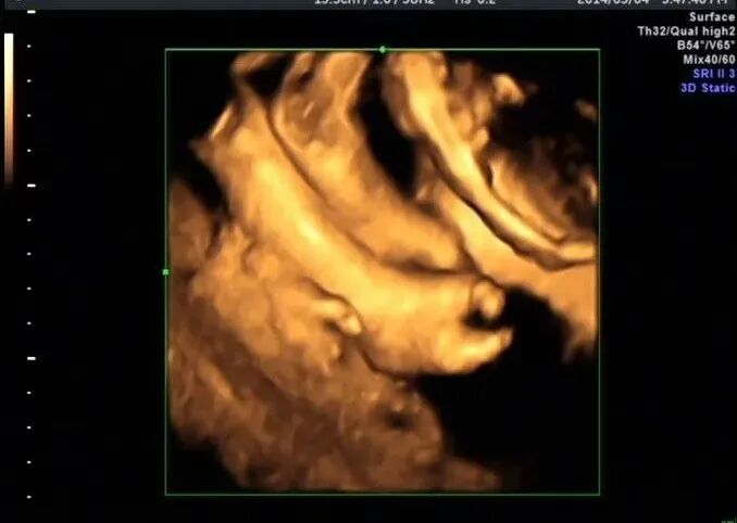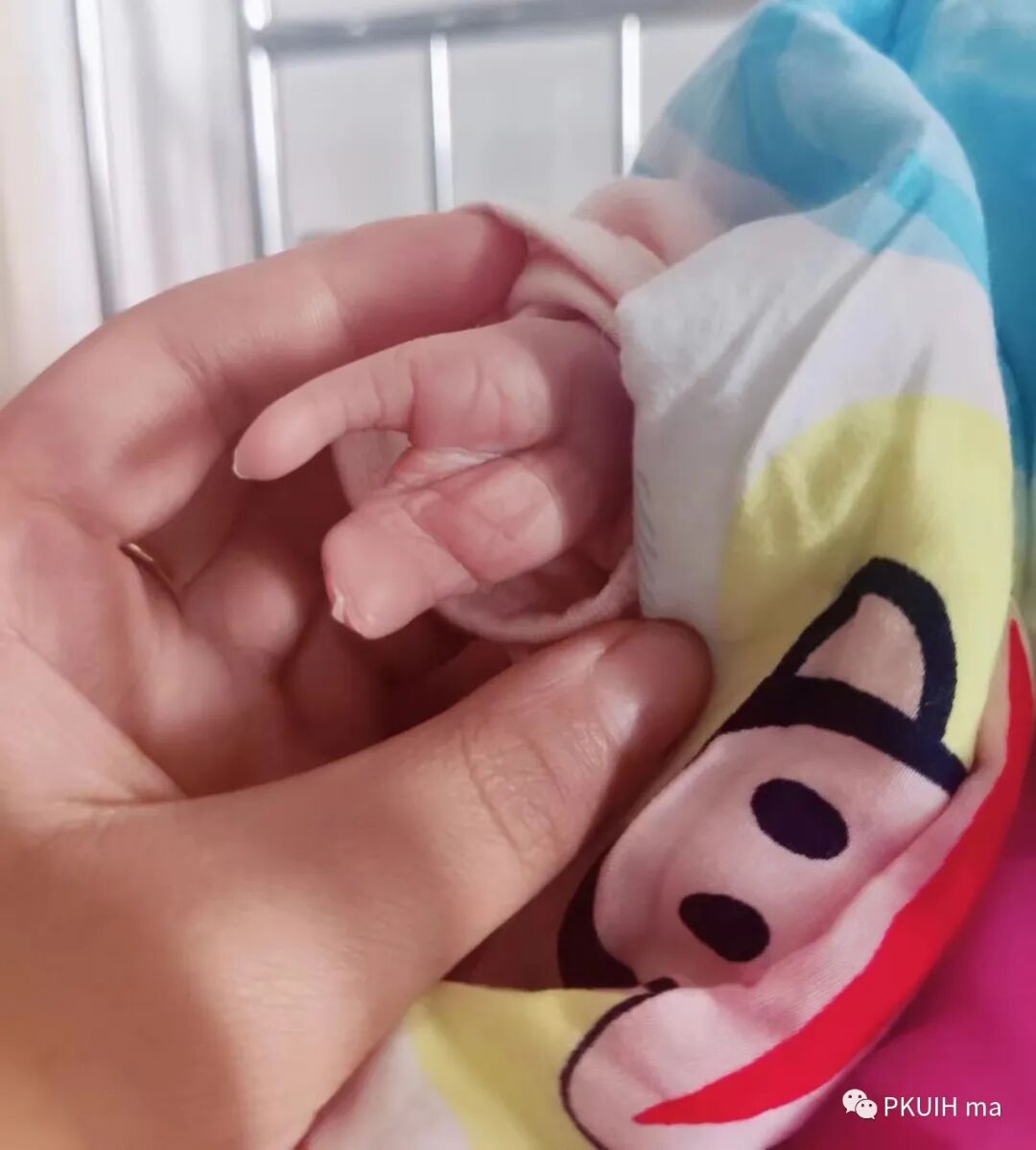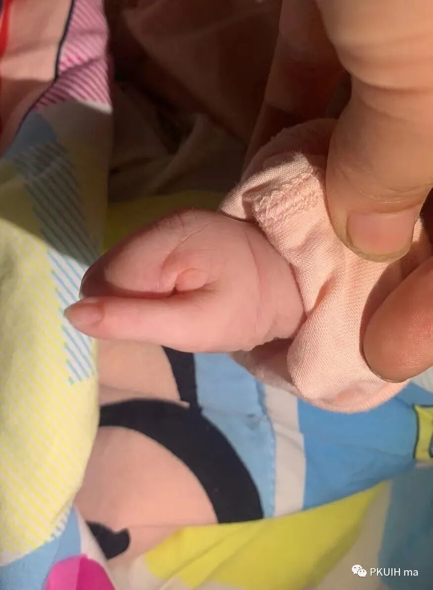 上图这个宝宝只是一只手有问题,可能无染色体异常,原因可能是羊膜束带造成的手裂及并指、缺指畸形。同时让人欣慰是这个宝宝异常是在左手,后期治疗后应该能恢复简单功能,日后不影响生活和学习。
