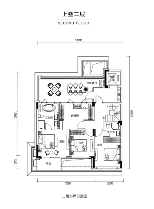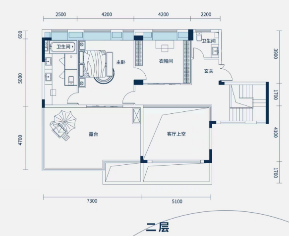 2层主要是主卧大套间+大露台的设计,客厅上空的挑高也可以利用起来,再打造一个书房,完全可以做到上、下层不收打扰,已经是很多人梦寐以求的房子。