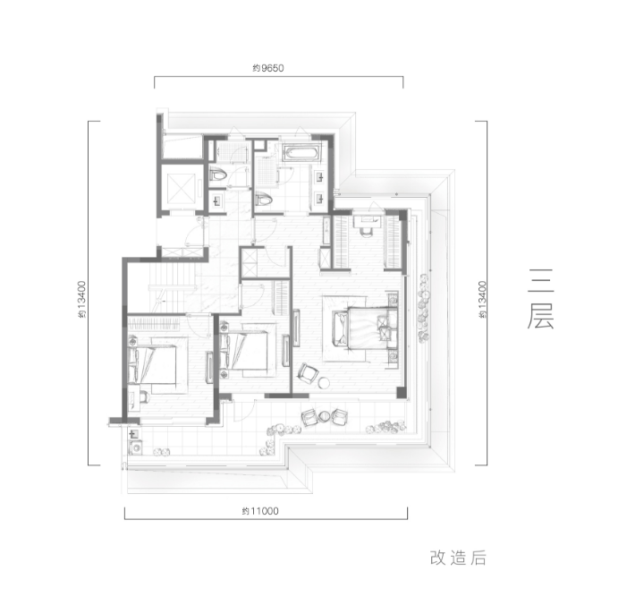 但是仍然存在“三套间”的遗憾,四层的卧室如果能打造成套间更好,毕竟是三代人起居,即便女儿偶尔过来住,也最好能为她留一个大套间。