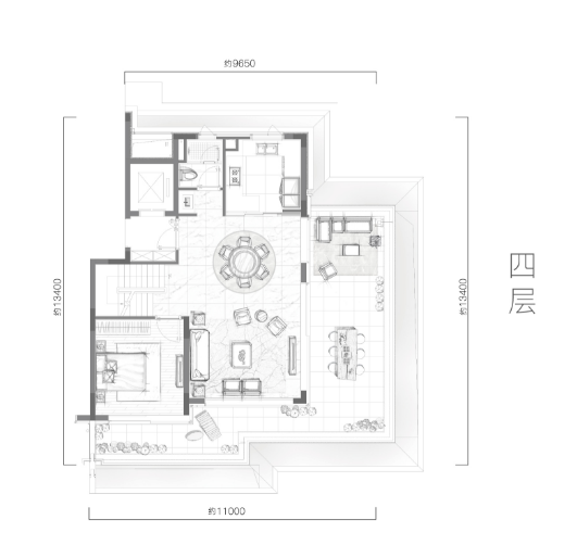 它的布局与前两个产品略微有些不同,能建长江华府是放大主卧的居住体验,上面一层都是主卧跟大露台,绿城湖畔云庐更注重社交,让大露台与客餐厅一起,形成巨大的聚厅。