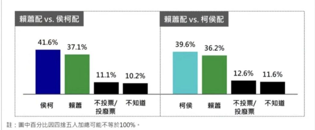 举例来说,《ETtoday新闻云》14日晚间公布2024大选民调,若蓝白整合成功,侯友宜当正、柯文哲当副,对上赖清德与驻美代表萧美琴,“侯柯配”支持度为41.6%,“赖萧配”为37.1%,若“柯侯配”为39.6%,“赖萧配”为36.2%。