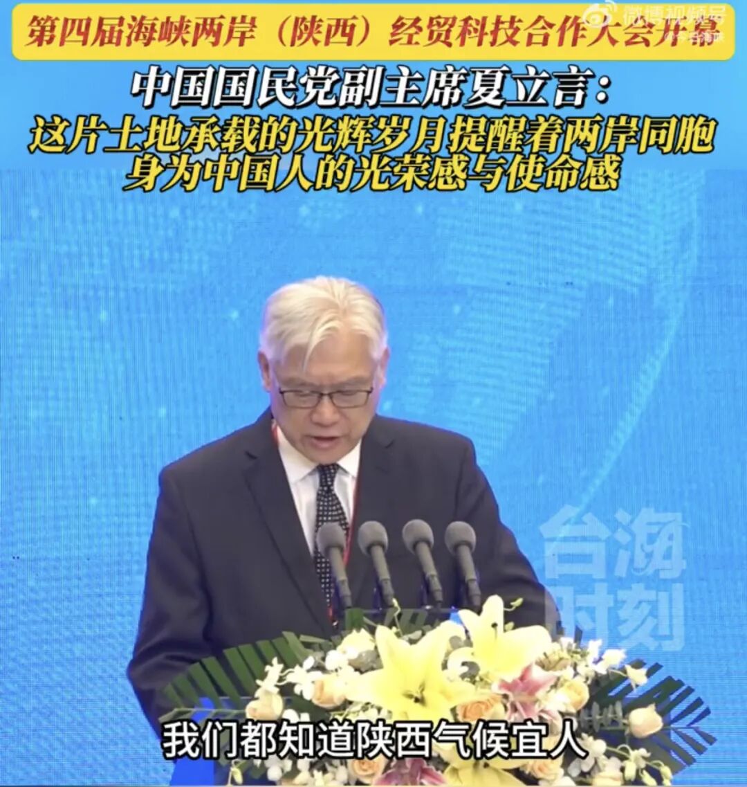 10月24日,第四届海峡两岸(陕西)经贸科技合作大会在西安开幕。中国国民党副主席夏立言致辞时表示,陕西气候宜人,农牧发达,经济与自然条件都很优越,关中平原的八百里平川,物产丰饶,而且地势险要,不仅是孕育了华夏文化的摇篮,也是保障中华文化不断发展茁壮的战略福地,在上下五千年的历史长河当中,具有举足轻重的独特地位,秦陇大地险峻秀丽的山河风光,承载着历时千余年的光辉岁月,成为深藏在两岸每个中华儿女心中的共同记录,在在提醒我们身为中国人的光荣感与使命感。