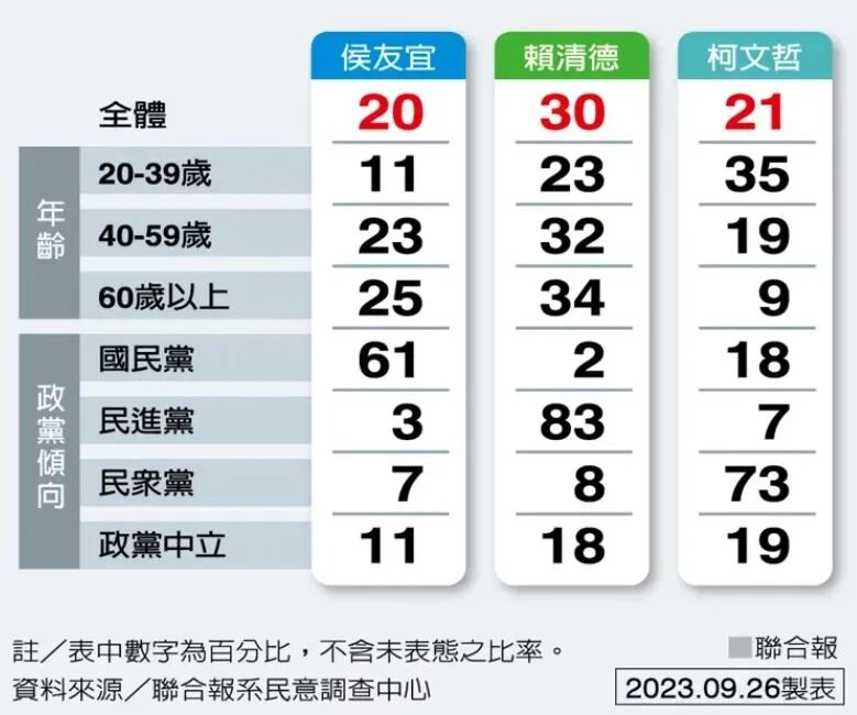 在四十岁以下年轻人中,柯文哲以35%的支持度大幅领先侯友宜和赖清德,在四十岁至五十九岁、六十岁以上的选民中,赖清德分别以32%及34%的支持度领先其他两组候选人。
