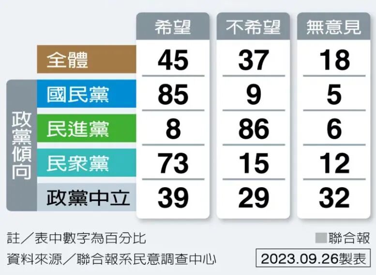 是否希望2024下架民进党?民调显示只有45%希望,不希望的有37%,无意见的有18%,“六成民意支持下架民进党”的说法没有从这份民调中得到印证。(联合报系民意调查中心)