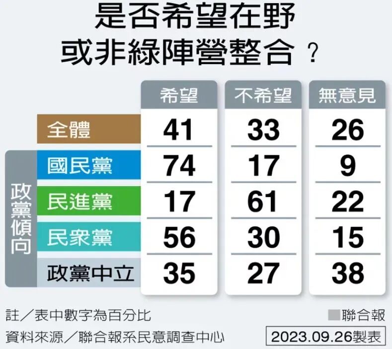 此外,有41%的选民希望看到侯柯郭三人整合成一组人选,33%不乐见非绿整合。其中,国民党支持者有74%希望在野或非绿整合,民众党支持者期待的比率是56%,民进党支持者则有61%不希望看到非绿整合。