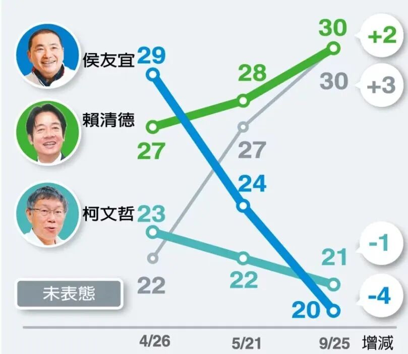 距离2024台湾地区领导人选举仅剩下百余天,根据台湾《联合报》最新民调,赖清德目前以30%的支持度领先,柯文哲21%,侯友宜则是20%垫底。该报趋势资料显示,侯友宜近5个月来支持率,从4月底的29%下滑至剩下20%;赖清德则从27%缓升至30%;柯文哲则无重大突破,在22%左右徘徊。