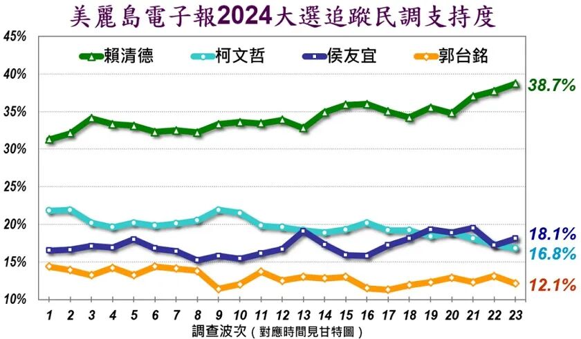 另外根据2024大选《美丽岛电子报》持续进行追踪民调,截止8月19日,最新民调显示,赖清德的支持度已经蹿升到39.4%,侯友宜与柯文哲分别获得20.4%、19.8%,都有下滑趋势。