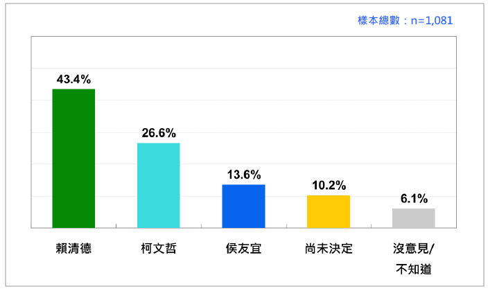 台湾民意基金会8月21日上午公布2024参选人最新民调,刚刚结束访美行程的民进党赖清德支持度43.4%,民众党柯文哲26.6%,国民党侯友宜13.6%。调查报告指出,赖清德支持度创个人历史新高,比2019年同月蔡英文支持度高出两个百分点。