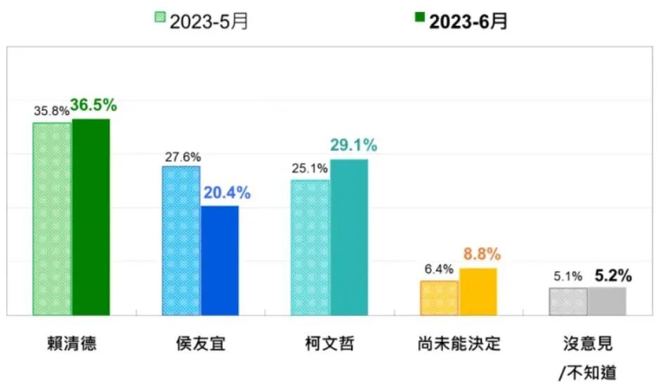 自国民党宣布2024征召人选已一月有余,但新北市长侯友宜的声势却持续低迷。中广-盖洛普21日公布最新2024大选民调,民进党参选人赖清德31.89%、柯文哲24.62%、侯友宜17.93%。而在前一天台湾民意基金会公布的6月最新民调中,赖清德以36.5%一马当先,柯文哲29.1%紧跟其后,国民党参选人侯友宜则是20.4%位居第3。
