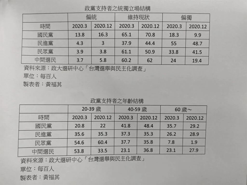 2021年4月,根据政大选研中心“台湾选举与民主化调查”的一组数据显示,一度被绿营侧翼猛攻为小蓝的民众党,政党支持者的统独结构从2020大选后接近中间选民的结构(每百位有62位维持现状、19.4位偏独),至当年年底转变为类似民进党的结构,维持现状者从61.1位降为50.9位,偏独者从33.8上升到41.5。