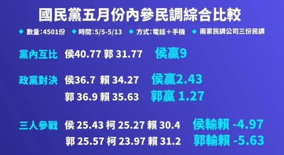 虽然在侯友宜确定被征召当日,国民党文传会随即开记者会,公布内参民调数据。指出,无论是国民党内参民调还是外部13家民调结果综合评比,侯友宜都是蓝军最强人选,且民调执行内容及方式,侯、郭都完全清楚,没有黑箱问题。