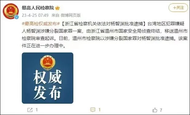 4月26日,国台办举行例行新闻发布会,就两岸热点问题回答记者提问时,发言人朱凤莲表示,4月25日,最高人民检察院发布信息,台湾地区犯罪嫌疑人杨智渊涉嫌分裂国家罪一案,由浙江省温州市国家安全局侦查终结,移送温州市人民检察院审查起诉。日前,温州市人民检察院以涉嫌分裂国家罪对杨智渊批准逮捕。该案件正在进一步办理中。