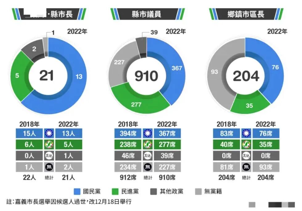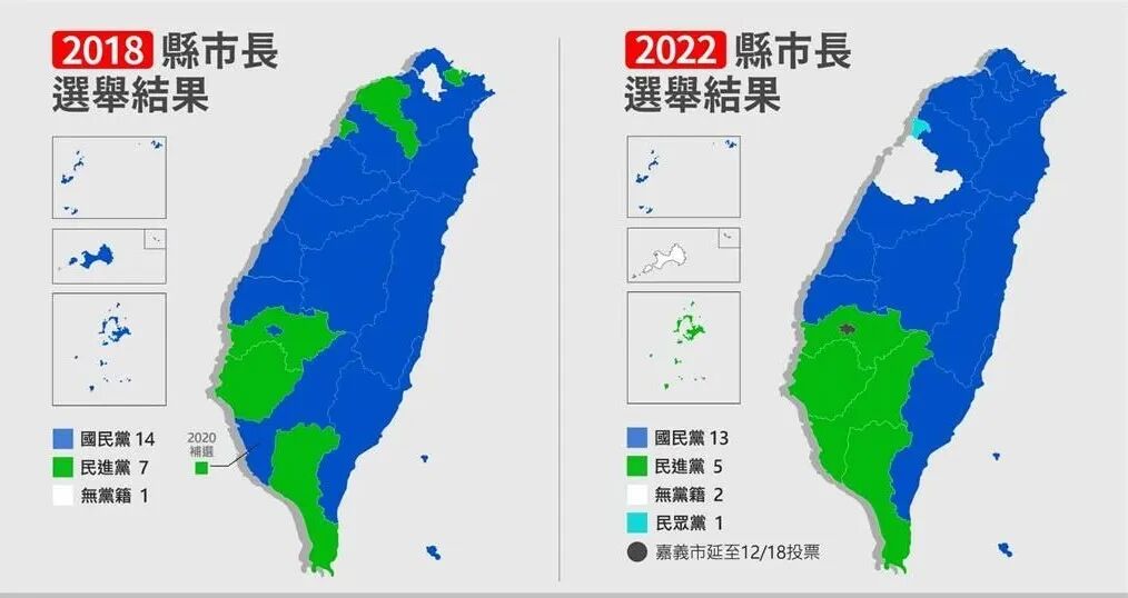 这次最具指标意义的六都市长提名皆由蔡英文主导,不惜让党内初选机制作废,但台北、桃园、新竹全部落败。虽然民进党重挫的声音不绝于耳,但总览22县市,扣除嘉义市选举延期,国民党夺13县市、民进党5县市、民众党1县市、无党籍2县市。对比2018年九合一,国民党15比民进党6的局势,蓝绿版图只有小幅变化。