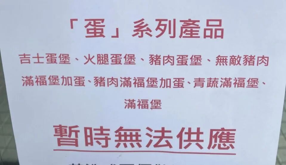 2月19日,还有一名网友在PTT贴出麦当劳的公告,“亲爱的来宾您好,因销售超出预期,蛋系列产品(吉士蛋堡、火腿蛋堡、猪肉蛋堡.......)暂时无法供应,造成不便敬请见谅。”