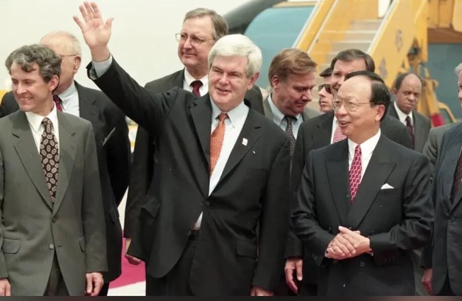 1997年4月2日,当时美国众议院议长金瑞契(中)短暂窜台3小时,美国空军专机飞抵台北松山军用机场时,外事部门负责人的章孝严(右)到场接机。(联合报)