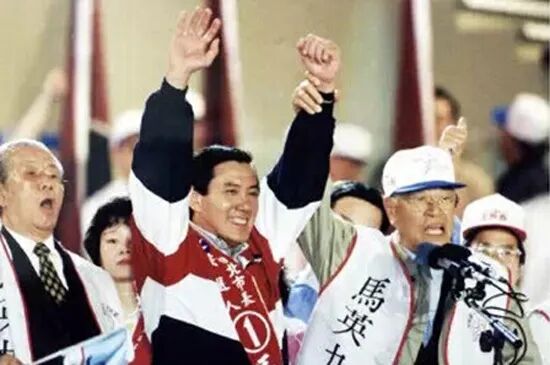 对等政治实体论为李登辉制造“两个中国”提供了理论依据,图文1998年台北市长选举,李高举马英九的双手。(图片来自网络)