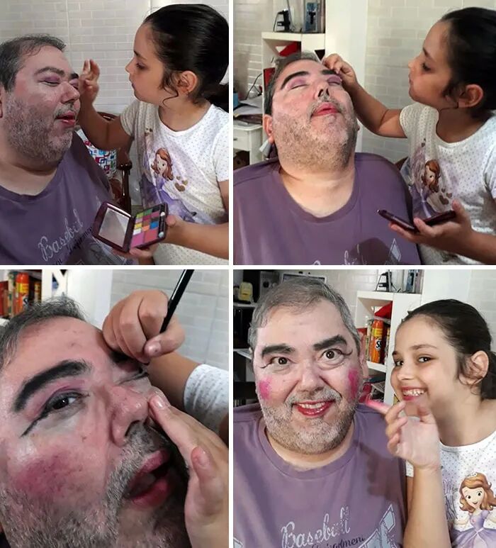 都说女儿是爸爸的小棉袄,但是当小棉袄作起妖来之时,也会让许多的爸爸感觉到无可奈何,因为许多的女孩天生就是爱美的小天使,但是为了想跟爸爸搞好关系,总是会拿爸爸的脸当练手的地方,而爸爸也只能让女儿任意的摆布,毕竟爸爸都要做女儿最坚强的臂膀,但是被女儿化了妆的父亲总是看起来十分的滑稽,今天让我们一起来欣赏那些在生活当中成为女儿奴,非常惯着女儿,却被女儿化妆成了妖娆美女的爸爸们。