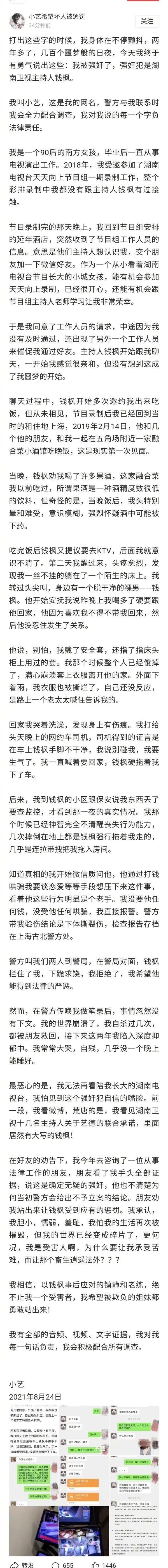 8月24号有一位网友爆料,自己在前几年因参加综艺节目天天向上认识的湖南卫视主持人钱枫,后来被其强奸并且。报警之后因为种种的原因最终没能。还自己一个公道,于是想趁着现在娱乐圈里整治不良艺人的风波,将原来的这条受伤受伤害的新闻重新爆料,希望能够将。主持人钱枫的真面目曝光,将其惩罚,让其受到法律应有的制裁。网友爆料自己在2018年的时候参加的湖南卫视天天向上的节目,在彩排过程当中没有和钱枫接触,后来回到酒店之后通过。工作人员的牵线搭桥,自己同意了钱枫的添加好友申请后,来钱枫多次邀请自己外出吃饭,有一次在吃饭的过程当中喝了一点儿没有多少度数的果酒,却感觉到意识模糊,头特别的晕,怀疑是酒中被下药,在自己意识模糊的情况之下,第2天却躺在陌生的床上发现钱枫已经脱得十分的干净,在自己身边自己查监控才知道自己在完全没有意识,神情恍惚站不住脚的情况之下,被钱枫拖入了房间之中。