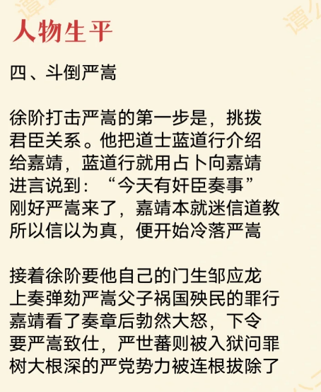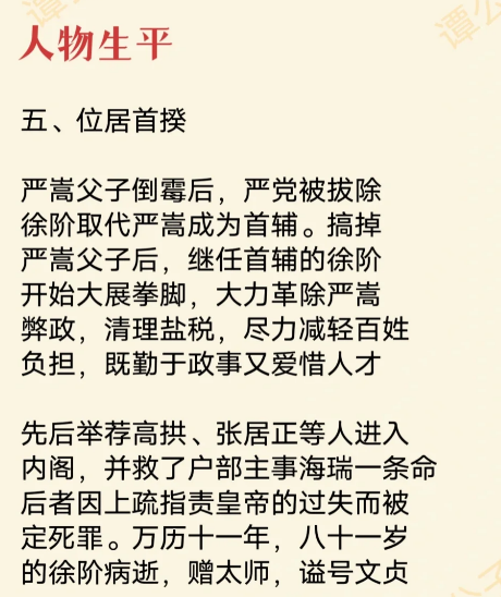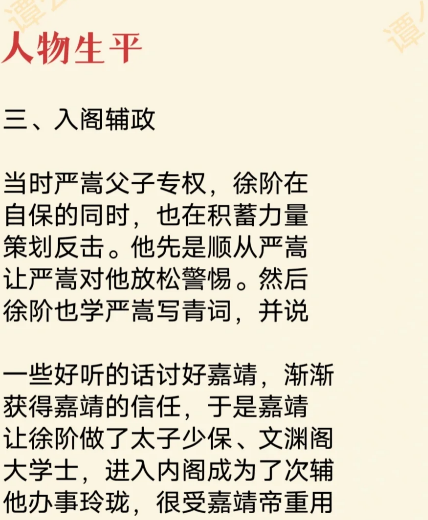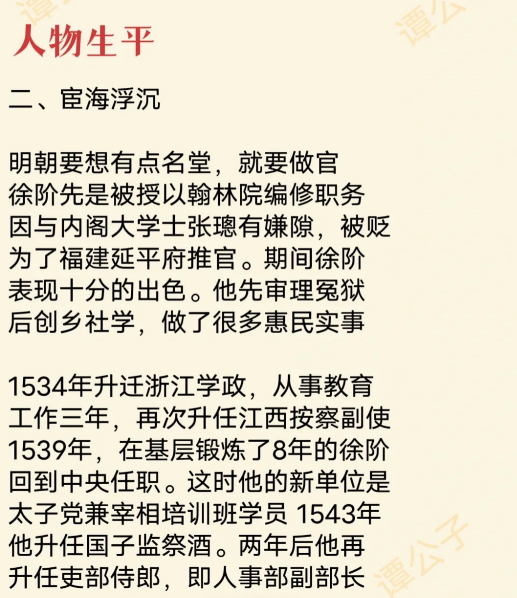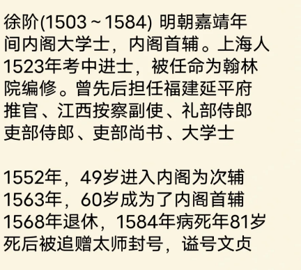徐阶为了给老师报仇,隐忍了几十年,把自己孙女嫁给严嵩儿子当妾,为的就是能一击毙命,作为明朝出名的首辅,我一点不喜欢他,虽然他为了所谓的正义,但是我始终觉得那种正义是一种扭曲了的正义,和于谦比起来,于谦更胜于徐阶