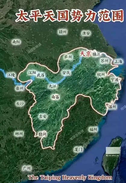 太平天国的势力范围就是江南一片。坐困江南,是太平天国的战略失误。要么北进,打到北京去,推翻满清,取而代之。要么向南,洪秀全带领起义军打回老家去,占领福建,广东,夺取出海口。这样,进,可以武装割据,和满清分庭抗礼;退,可以漂洋过海,远遁海外。向北向南都行,都比困守天京,全军覆没,要好的多!
