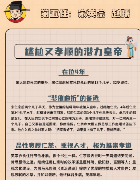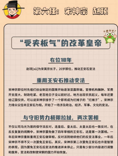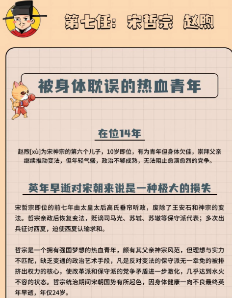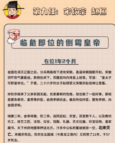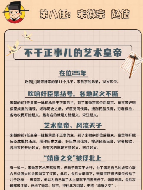 宋朝320年间历经18位皇帝,有昏庸无能的,有不务正业的,但还真没有像纣王、秦始皇这样狠毒残暴的,家风一直比较开明温和。北宋历经9位皇帝,享国167年,从开国皇帝宋太祖赵匡胤至宋哲宗赵熙,7位皇帝能力褒贬不一,但都是一脉相承都是干正事儿的主,开创“建隆之治”“仁宗盛治”、维持宋辽100年的和平、推进改革变法等,有的皇帝节俭朴素、有的皇帝宽厚仁慈、有的皇帝喜爱读书废寝忘食、有的皇帝热血爱国想做出一番伟业。到了宋徽宗赵佶这里败相尽显,逛青楼、重奸臣、怕金人,最终被俘北宋灭亡。