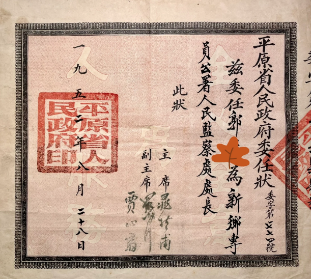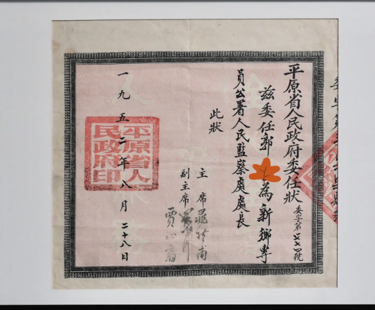 1952年8月28日,平原省人民政府主席晁哲甫等签发该委任状。可在3个月后,平原省消失了!