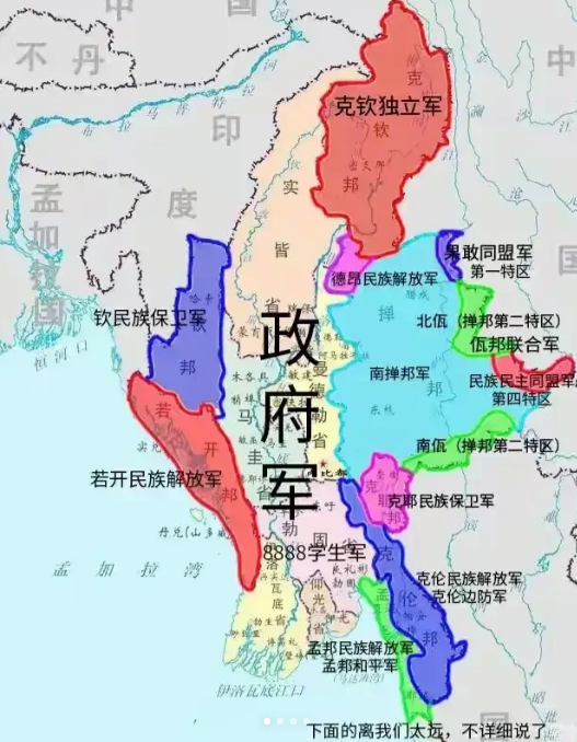 这就造成了一种困扰,明明缅甸实质上并未统一,四分五裂,各国都只和缅甸政府打交道,而忽视其军阀割据的客观现实。曾几何时,美国曾经公开和各路军阀打交道,缅甸政府也没办法。缅甸军阀割据的势力分布并不是绝对的,在民族武装控制区也夹杂着政府军的据点,犬牙交错,长期混战。