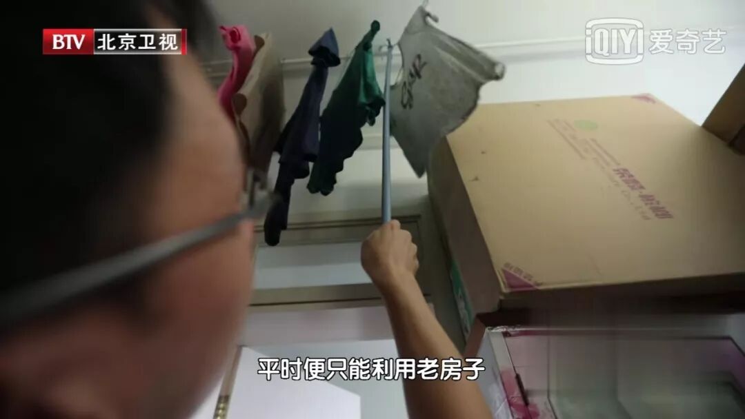 这个房子让两个人感觉到蜗居,两米的大床占据了整个屋子一半的空间,而这是他们主要的生活活动区域。两个人都是从事it行业的,每天都要有很长的时间对着电脑工作,平时需要时不时活动一下身体,奈何空间不足,只能在床上完成,连个晒衣服的地方都没有,只能放在屋顶原有的杆子上,收纳空间是床底下的抽屉和衣柜,