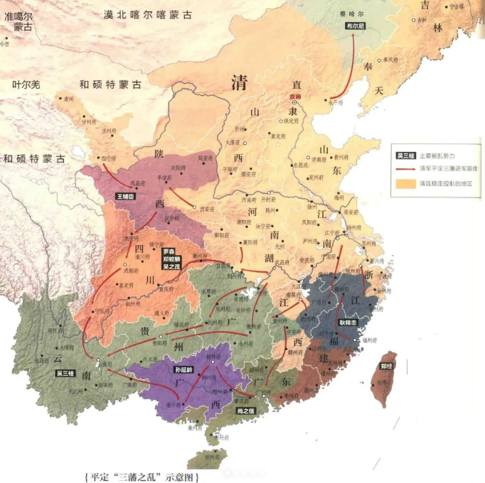 公元1673年,康熙主动下令撤藩,意在彻底解决藩镇尾大不掉的问题,却因此引发了长达八年之久的三藩之乱。尽管叛军曾一度攻陷滇、黔、湘、桂、闽、川六个省,但玄烨采取孤立吴三桂招抚其他叛军的方法,随着吴三桂病逝叛军被歼灭,藩镇问题得到彻底解决。公元1683年,自延平王郑经去世后,台湾内部已经乱成一团,康熙皇帝趁机一鼓作气收复了台湾。公元1685年,为了彻底驱逐沙俄对东北地区的蚕食力量,康熙先后几次派兵打败沙俄军队,并于1689年与沙俄缔结了《尼布楚条约》,双方不再发动战争,大清王朝得以腾出手来应对蒙古内乱。公元1688年,漠西蒙古准噶尔在领袖噶尔丹的统治下,借助沙俄的支持企图统一蒙古入侵大清王朝,康熙先后在乌兰布通和昭莫多大破准噶尔,却始终未能彻底击垮噶尔丹