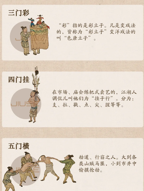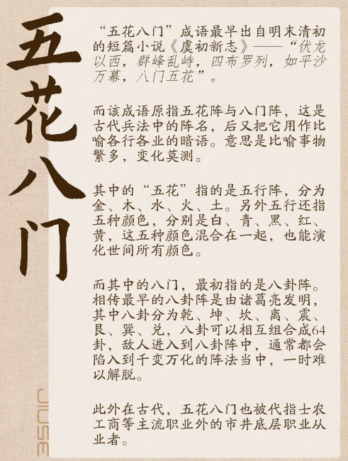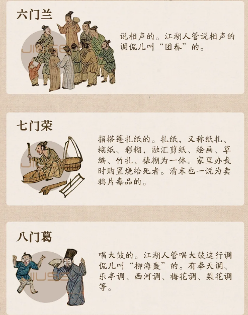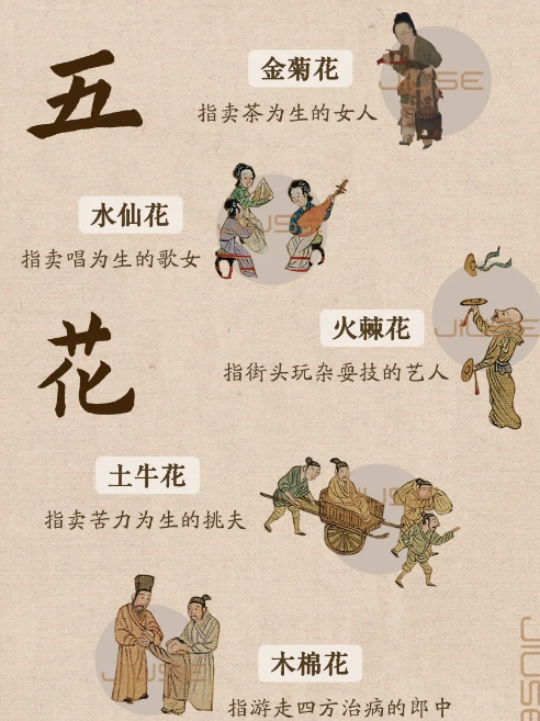 现在我们经常用“五花八门”这个词语形容名目繁多,但在古代,这个成语也被具体指定为几种特定的行业哦~-👉“五花”为:金菊花:卖茶为生的女人;水仙花:卖唱为生的歌女;火棘花:街头玩杂耍技的艺人;土牛花:卖苦力为生的挑夫;木棉花:游走四方治病的郎中。-👉“八门”为:一门金:算命占卜的人;二门皮:卖草药人;三门彩:变戏法的人;四门挂:江湖卖艺的人;五门横:劫道、行窃的人;六门兰:说书评弹的人;七门荣:搭篷扎纸的人;八门葛:高台唱戏的人。
