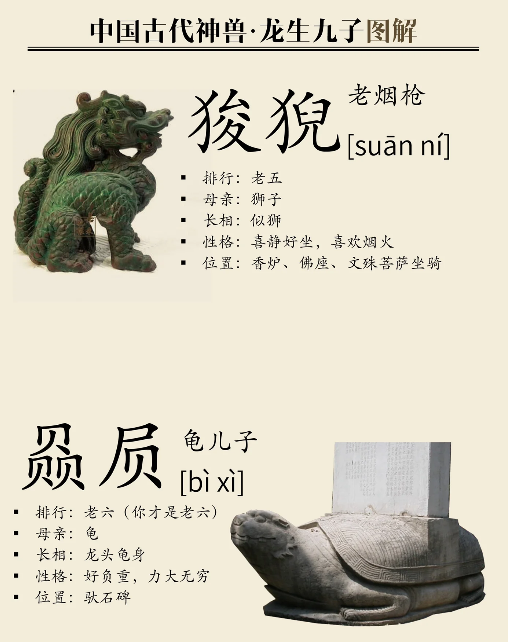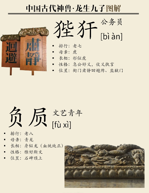 📌7.七子狴犴📌形似虎好讼,狱门或官衙正堂两侧有其像📌8.八子负屃📌身似龙,雅好斯文,盘绕在石碑头顶
