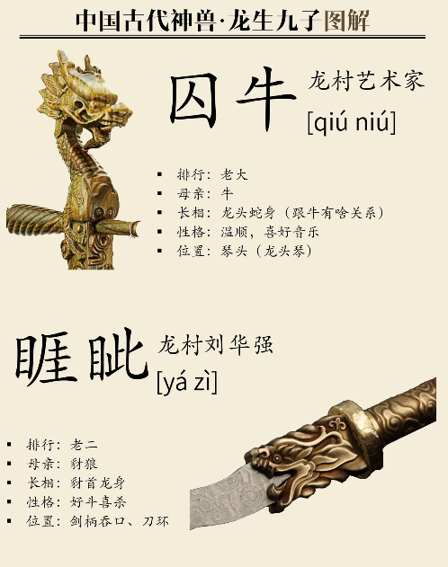 📌2.次子睚眦📌嗜杀喜斗,刻镂于刀环、剑柄吞口,心胸狭隘📌3.三子嘲风📌形似兽,是老三,平生好险又好望,殿台角上的走兽是它的遗像。也有人一直认为它是有着龙脉的凤