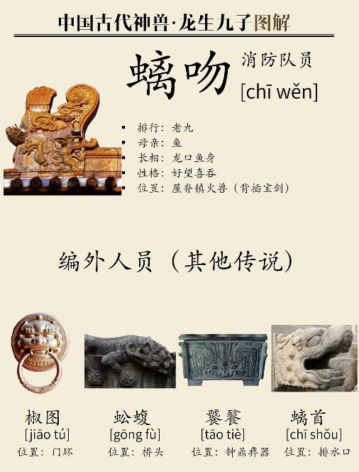 📌9.九子螭吻📌又名鸱尾或鸱吻,口润嗓粗而好吞,遂成殿脊两端的吞脊兽,取其灭火消灾还有一些说法中,将椒图、蚣蝮、饕餮、螭首、朝天吼等也列入龙子之一,如:老大赑屃、老二螭吻/鸱尾、老三蒲牢、老四狴犴、老五饕餮、老六蚣蝮、老七睚眦、老八狻猊、老九椒图