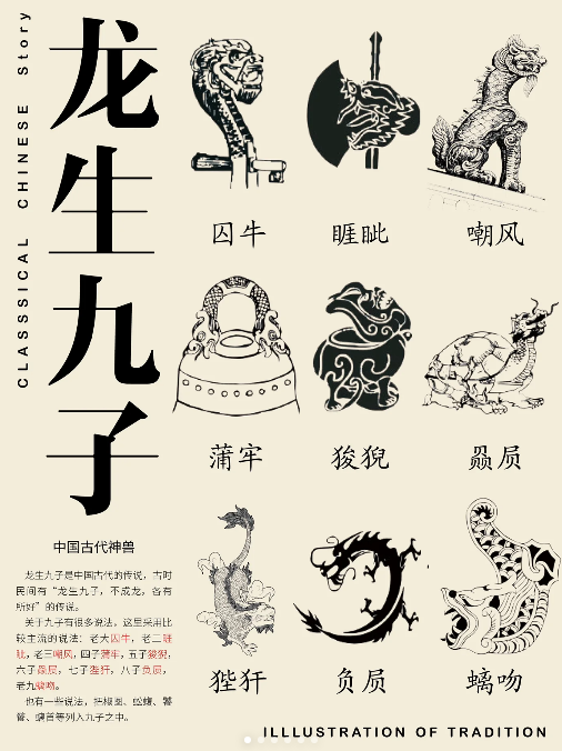 龙是中国的图腾,古代中国神话传说龙生有九子,九子不成龙,各有所好。关于九子的说法有很多种版本,这里介绍一下最有代表性的版本: