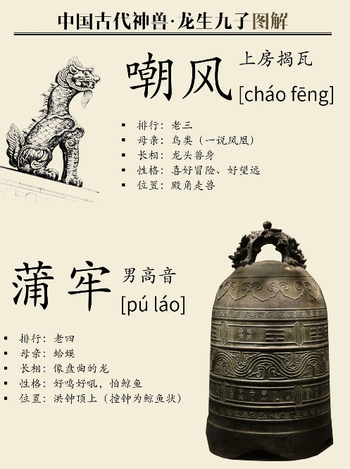 📌4.四子蒲牢📌受击就大声吼叫,充作洪钟提梁的兽钮,助其鸣声远扬📌5.五子狻猊📌