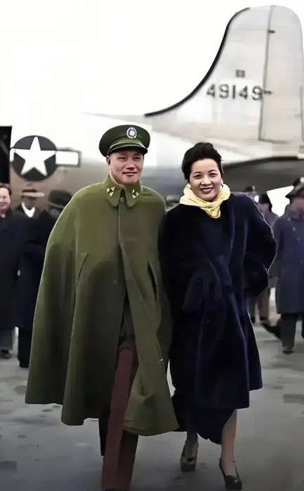 这张照片拍摄于1947年,当时两人乘坐专机抵达延安机场时随行记者抓拍下了这个瞬间。照片中的蒋介石身穿一身军大衣,嘴角露出一丝笑容,大有一副天下舍我其谁的气势。而宋美龄穿着貂皮大衣,脖子上围着一个鲜艳的围巾,笑容满面,一副春风得意的样子。此次也是夫妇俩第一次来到延安也是唯一的一次,最后兵败如山倒逃回台湾。