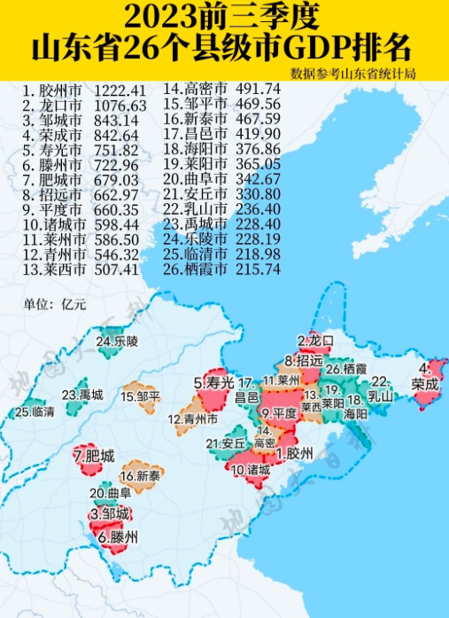 2023年前三季度,山东县级城市GDP(经济总量)胶州市一骑绝尘,实现经济总量1222.4亿元,领跑各县级市经济总量,且胶州市为胶东国际机场所在地,物流地位突出,高质量发展成果显著。龙口市屈居第二位,实现经济总量1076.6亿元,龙口市工业企业较多,裕龙岛炼化一体化项目正如火如荼建设,预计年底投产,必将为经济发展注入新动力。多数网友可能认为兖矿是在济宁兖州区,实际兖矿集团位于邹城市,邹城也是老牌百强县,家里有矿,妥妥的富家子弟。荣成市前三季度经济总量位于山东各县第四位,位次虽不错,但是已经大幅落后之前,过去的荣成,曾一度为山东第一位。寿光市实现经济总量751亿元,全年也是非常有希望突破千亿大关的,寿光产业既有现代农业,工业也非常发达,是全国重要的蔬菜基地。