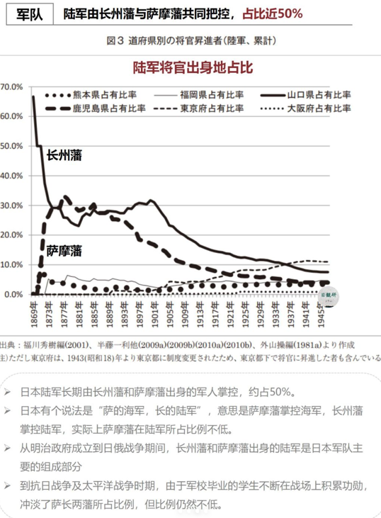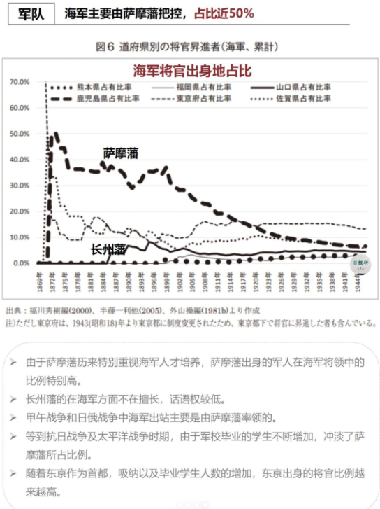 日本直到20世纪初期的明治天皇时期,才开始实行中央集权,后来说的“大日本帝国”来源于此。帝国建立后,萨长两藩的家臣们提出废除士农工商四个阶层,实行四民平等,一视同仁。原先各藩的家臣们想在新政府任职的给你们安排工作,不想的话自谋生路。中央政府和海陆军队的各个职位方面,萨长两藩的家臣们就不客气了,毕竟是他们打下来的天下,当然要举贤不避亲了。首先是组建内阁,虽然萨长两藩占据重要岗位,但是大量的职位也分润给了其他各藩有能力的家臣。然后组建帝国议会-众议院和贵族院。众议院的席位主要是让各藩的家臣们去争选,分散他们的注意力;贵族院主要就是各藩的大名以及一些皇亲国戚,省得他们没事找事。司法机关方面,萨长两藩不好介入太深,大法官以及关键位置是他们的人就好,其他职位就让别人去争。但是海陆军队的领导指挥权,那就不能让了。日本有个流传很广的说法是“萨的海军,长的陆军”,意思是日本海军属于萨摩藩,日本陆军属于长州藩。这句话对也不对。首先是陆军方面,根据日本明治时期将官出身地统计数据显示,明治初期的陆军将官大部分是长州藩和萨摩藩出身。长州藩和萨摩藩所占的比例处于均势,相差并不大。两者相加占据将近60%的比例。后来随着军事学校的建立,出身地改称为出身学校了,但是长州藩和萨摩藩出身占据的比例仍然不低,毕竟他们身居军队高层,方便提携家乡人。