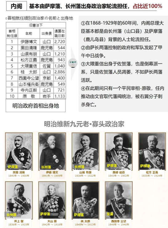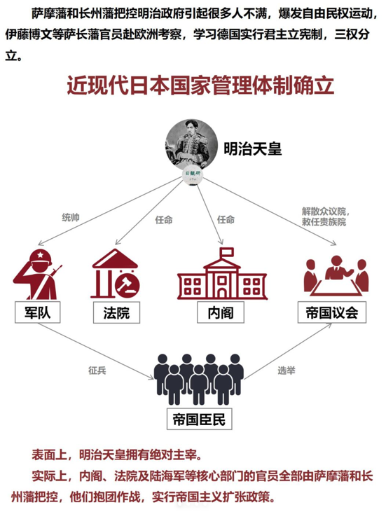 其次,在海军方面,那就是萨摩藩独步天下了。萨摩藩领地在鹿儿岛,海军实力本来就是各藩中最强的,加之对海军教育的重视,所以萨摩藩海军将领人数最多。后来的甲午中日战争以及日俄战争的海战,基本上是由萨摩藩带人打的。多说一句,萨摩藩和长州藩两个联盟实力并不相当,萨摩藩比长州藩强的多,相当于我国现在的广东省和广西省,而且萨摩藩的家臣能人也很多,只是由于征韩论,导致萨摩藩内部陷入分裂。支持征韩论的西乡隆盛带着自己萨摩藩派系发起了西南战争,这一战萨摩藩死了不少人,导致萨摩藩和长州藩的实力反而差不多了,达成均势,这也是日本明治政府时期没有内部分裂,相互倾扎的重要原因。以上就是明治维新的政体改革了,经过这一次改革日本完成了中央集权,学习西方的君主立宪体制,完成了对臣民的全方面把控。他们再也不是丰臣秀吉时期,由丰臣带领一帮小弟就去进攻朝鲜的落后体制了,明治维新后,日本迈向了帝国主义,在教育、产业以及军队方面开始全面向西方学习。