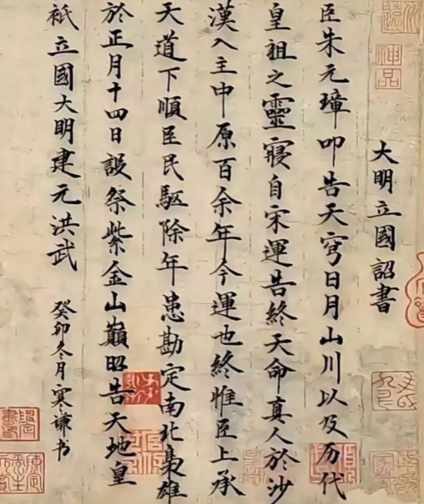 臣朱元璋,叩告天穹日月山川,以及历代皇祖之陵寝:自宋运告终,天命真人于沙漠入主中原百余年,今运也终。惟臣上承天运,下顺臣民,驱除年患,勘定南北枭雄,于正月十四日,设祭紫金山巅,昭告天地皇衹,立国大明,建元洪武。