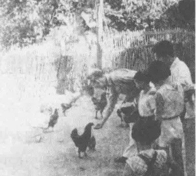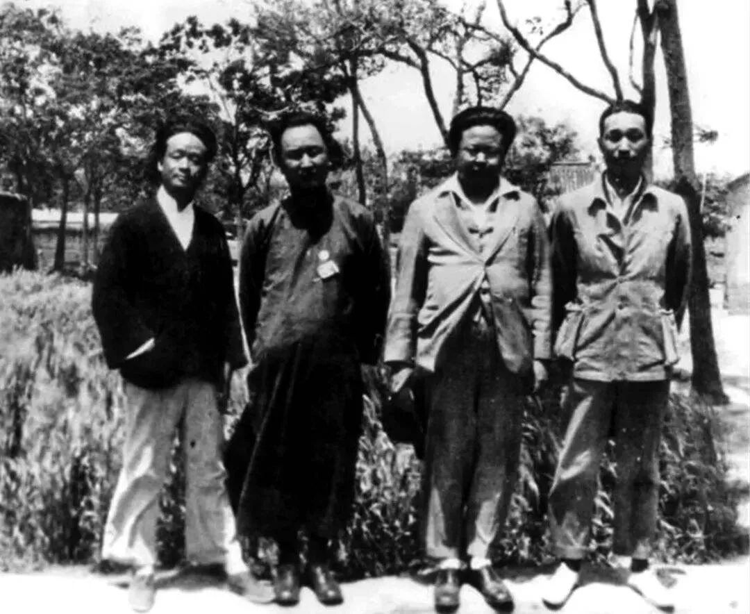 金岳霖喂鸡,身后三人依次为梁思成、梁从诫、梁再冰