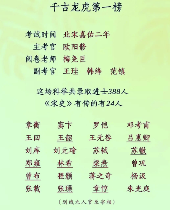 再次,这次恩科“唐宋散文八大家”参与度很高。主考官欧阳修,考生苏轼、苏辙、曾巩,未被录取的苏洵,八大家的北宋6位中除王安石外其余5人都有参与,简直就是“唐宋八大家”在开研讨会。还有,这榜出了许多历史重要人物。如图所示,录取388人,《宋史》立传者24人,9人做过宰相(名下划线者)。虽然其政绩褒贬不一,但自身实力属于一流。特别是王韶,中进士后成为对抗西夏的重要将领,是文武双全之才;还有深度参与“王安石变法”的吕惠卿,也名震一时。最后,就是这次的状元,被北宋名相章惇的亲侄子章衡夺了去,章惇觉得位列侄子之下有点羞耻,于是拒不受敕回家重新备考。嘉祐四年再次科考,名列第一甲第五名,开封府试第一名,这才受敕致士,后来一路干到宰相。总结:此次科举考试之所以出现这么多名人,成为千古第一榜,这与慧眼识人的考官欧阳修和梅尧臣是分不开的,正是二人具有伯乐之才,又抱着公心为朝廷选材,众多“千里马”纷纷涌现了出来。二人既为朝廷选了人,也为自己树了名,留下千古佳话,成为后世美谈。这次科考还有个特色,就是父子、亲兄弟(还有曾巩与曾布)、叔侄齐上阵,并且同一门的人还一起高中,可见,读书这件事要是有点家传会更容易些。