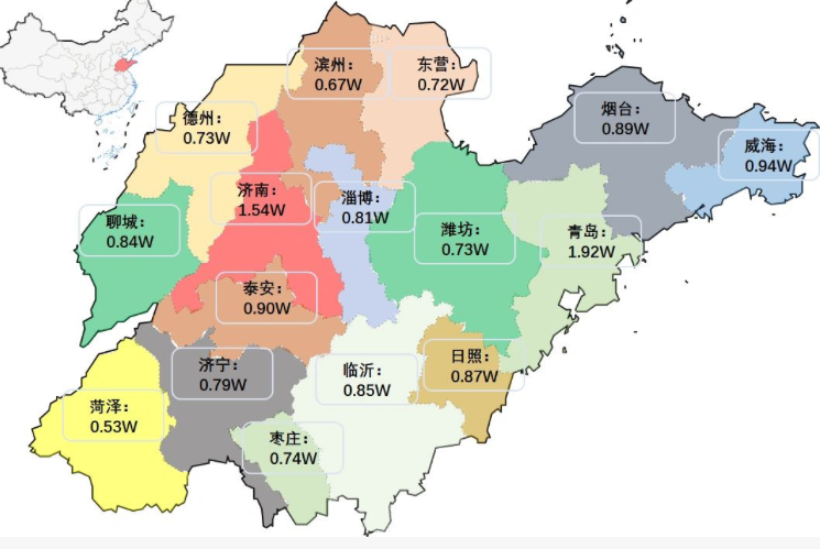 山东省房价地图,青岛最高,均价接近两万,济南1.5w左右